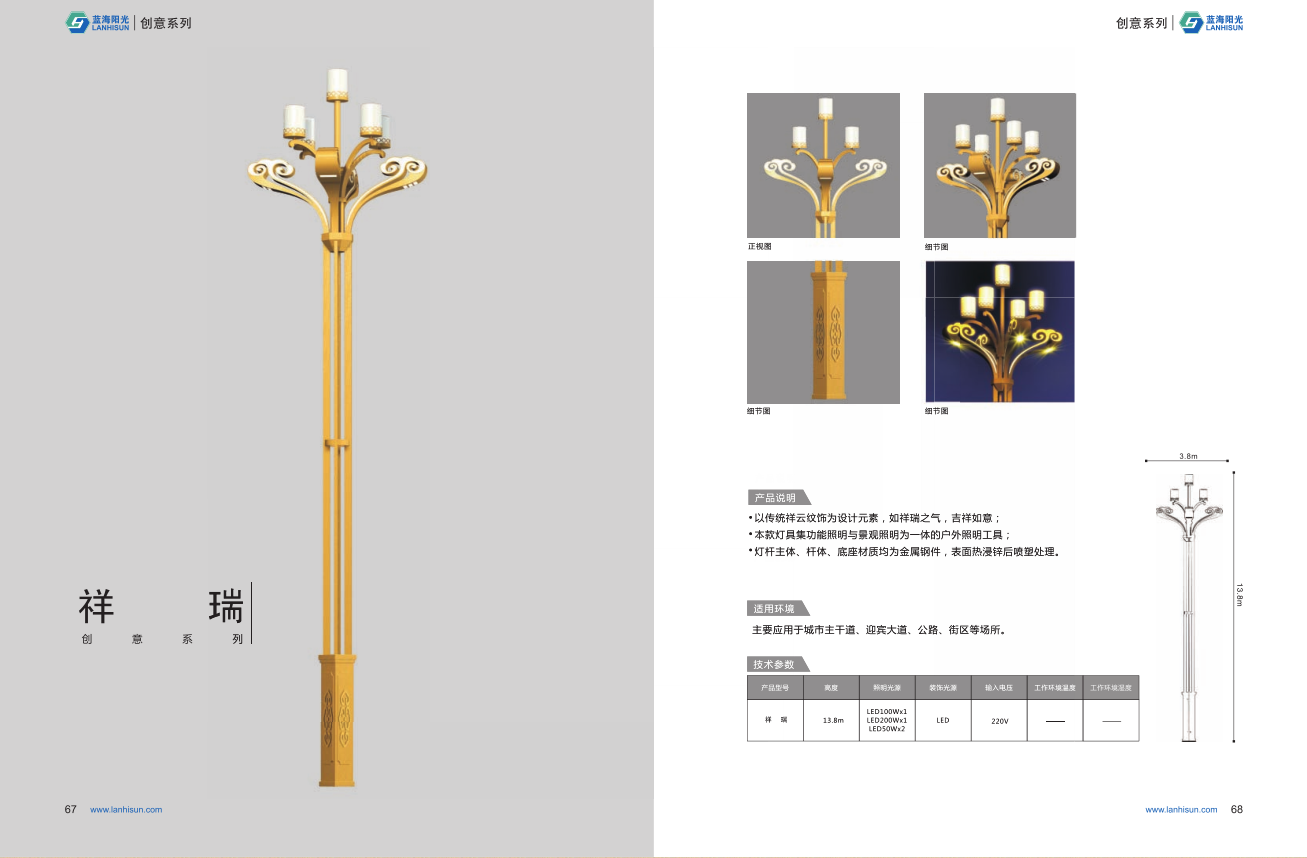 1、高度為6-16米; 2、花葉光源為4組LED光源,色溫2500-6500K,其余光源為LED裝飾光源,每個光源功率為30-60W; 3、LED驅動電源壽命可達五年; 4、整體熱鍍鋅噴塑,保證燈桿15年不生銹; 5、可以根據使用地區的地域文化、產業特點等進行文化定制;