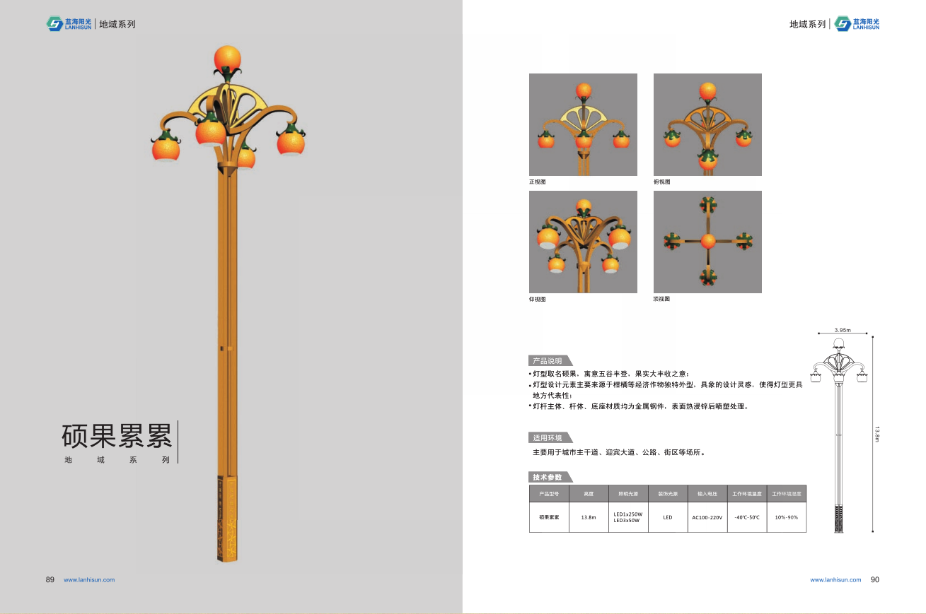 1、高度為6-16米; 2、花葉光源為4組LED光源,色溫2500-6500K,其余光源為LED裝飾光源,每個光源功率為30-60W; 3、LED驅動電源壽命可達五年; 4、整體熱鍍鋅噴塑,保證燈桿15年不生銹; 5、可以根據使用地區的地域文化、產業特點等進行文化定制;