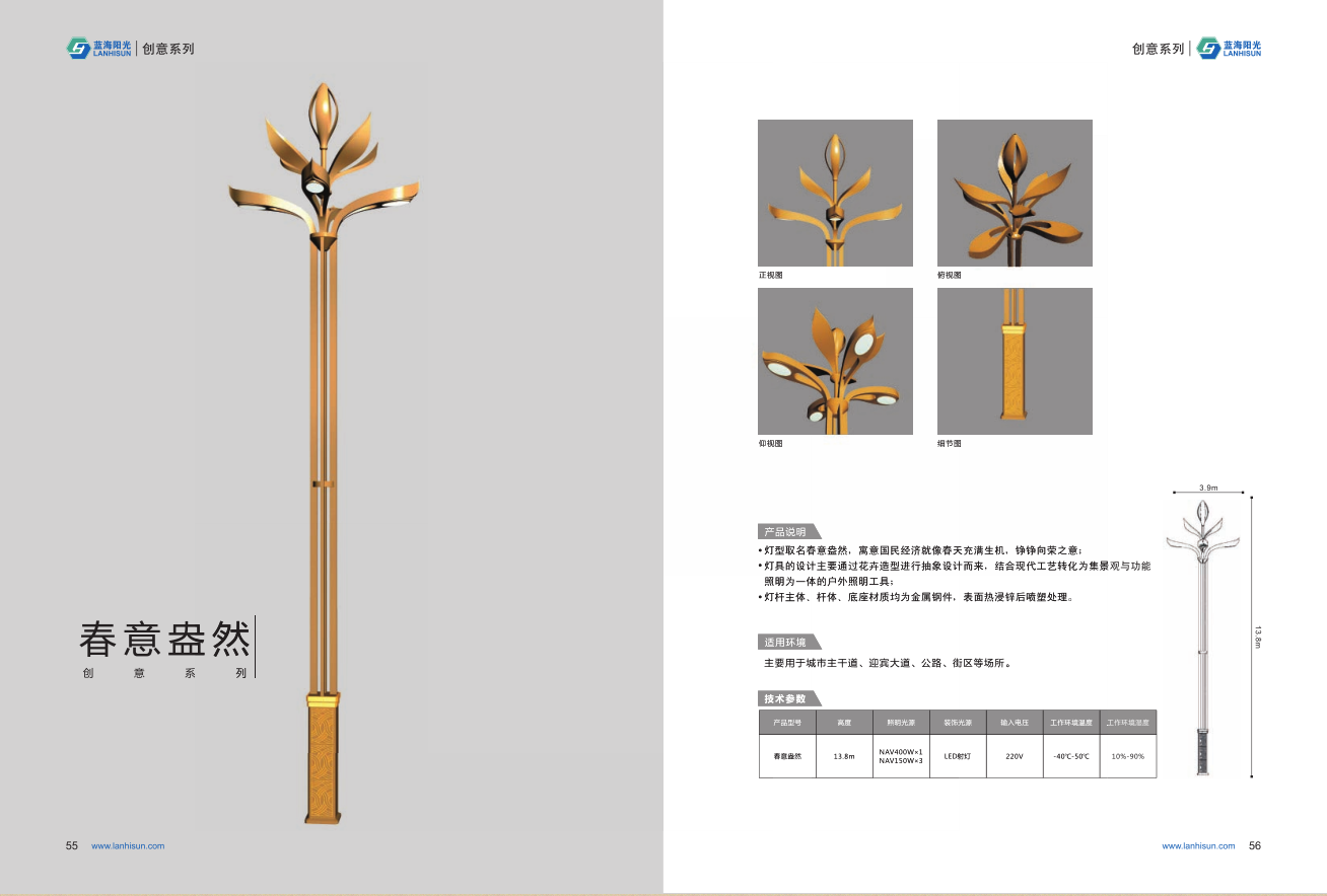 1、高度為6-16米; 2、花葉光源為4組LED光源,色溫2500-6500K,其余光源為LED裝飾光源,每個光源功率為30-60W; 3、LED驅動電源壽命可達五年; 4、整體熱鍍鋅噴塑,保證燈桿15年不生銹; 5、可以根據使用地區的地域文化、產業特點等進行文化定制;